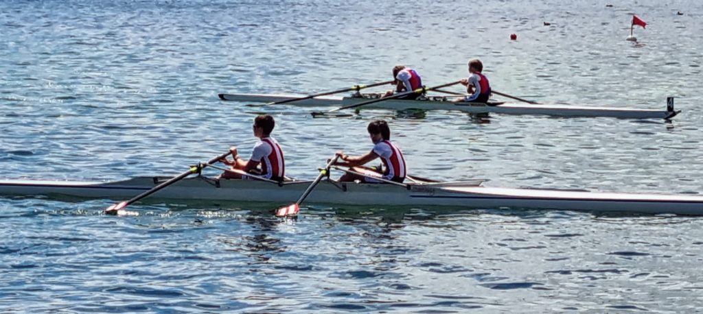 Nos 2 minimes Georges Elmur et Yannis Parris ont fait leur première expérience de compétition. Le premier jour n’a pas été simple un fort vent de travers poussait le bateau et les indications des arbitres en allemand sur le lac pas simple pour ce nouveau duo. L’ Allemand à l’école déjà pas simple mais sur un bateau avec du vent de travers…. Kevin va devoir faire des cours d’allemand pour nos minimes.