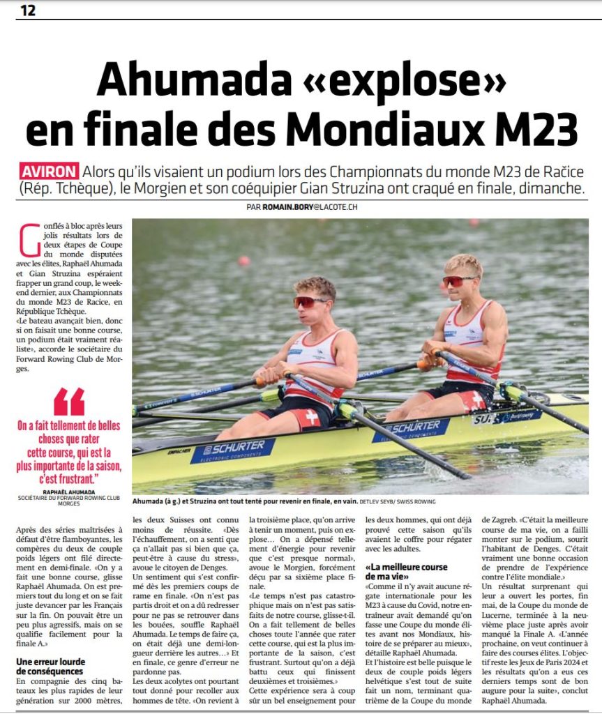 Exploit au Forward Rowing club de Raphaël Ahumada avec une 6ème places aux Championnats du monde U23 avec son camarade Gian Struzina du club de Zoug.