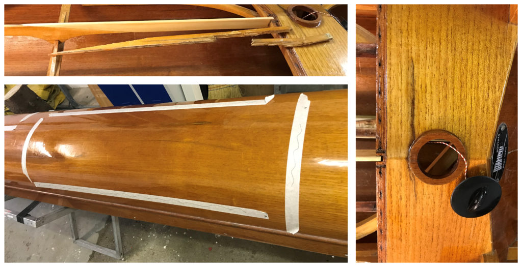 Mais appliquer ensuite la fibre fût un vrai plaisir car les tissus d’aujourd’hui sont de bien meilleure qualité que ce que j’avais utilisé il y a 30 ans. Donc pas besoin de peindre le bateau en blanc, comme je songeais un moment de faire, afin d’ainsi cacher nos travaux! Les nouvelles réparations et joints étants plus fins et robustes, nous avons enlevé au moins autant de poids que ce que nous avons rajouté par la suite. Mais nous n’avons renforcé qu’un sixième de la surface de la coque et la triplette reste donc très fragile, comme tous les vieux bateaux en bois. En dehors de la coque nous avons également réparé les bouts de bois cassés, remplacé les bouchons et refait les joints d’étanchéité. Comme nous ne pouvions pas débuter le gros des travaux avant la fin du mois d’août, nous étions dès le début pressés par le temps, sachant qu’il allait bientôt faire trop froid pour appliquer certains produits. Et en voulant gagner du temps, on en a en réalité perdu énormément.