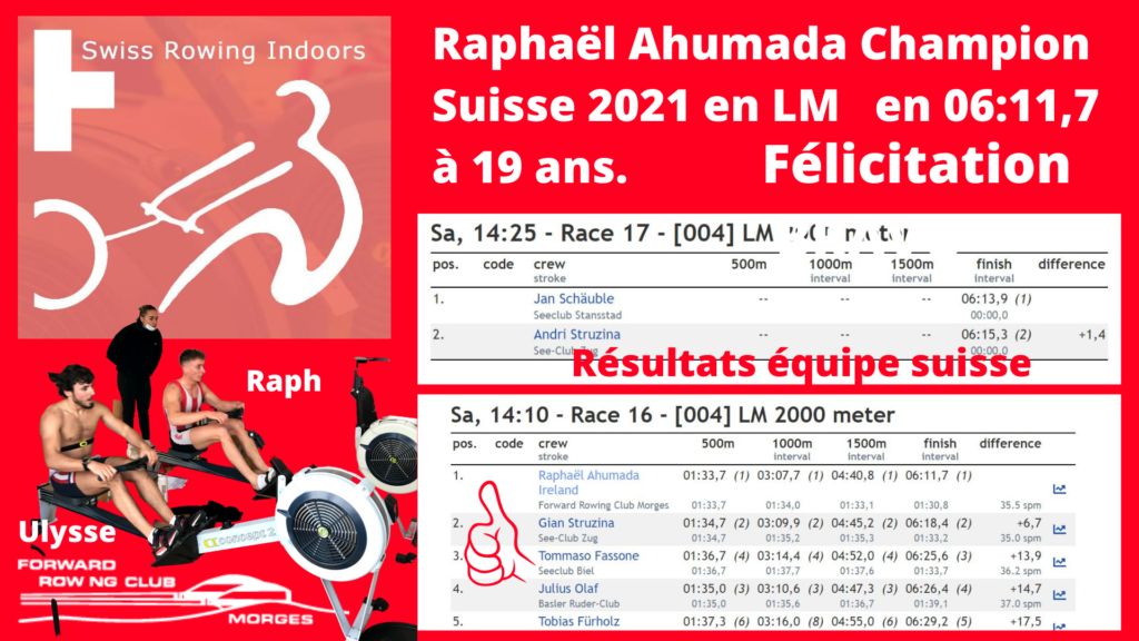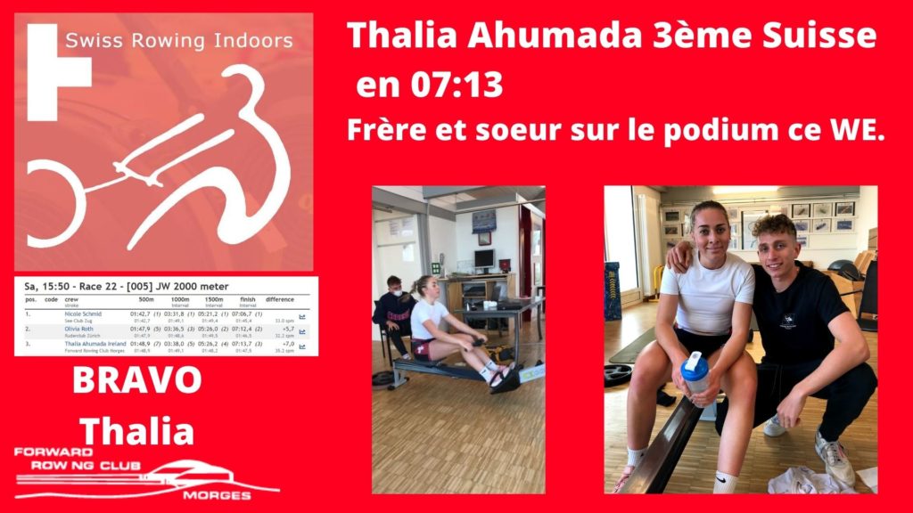 En ce jour du 6 mars 2021, le Forward Rowing Club s’est illustré au Suisse indoors en gagnant la médaille d’or en seniors poids léger pour Raphaël Ahumada et une médaille de bronze pour sa sœur Thalia en junior.
