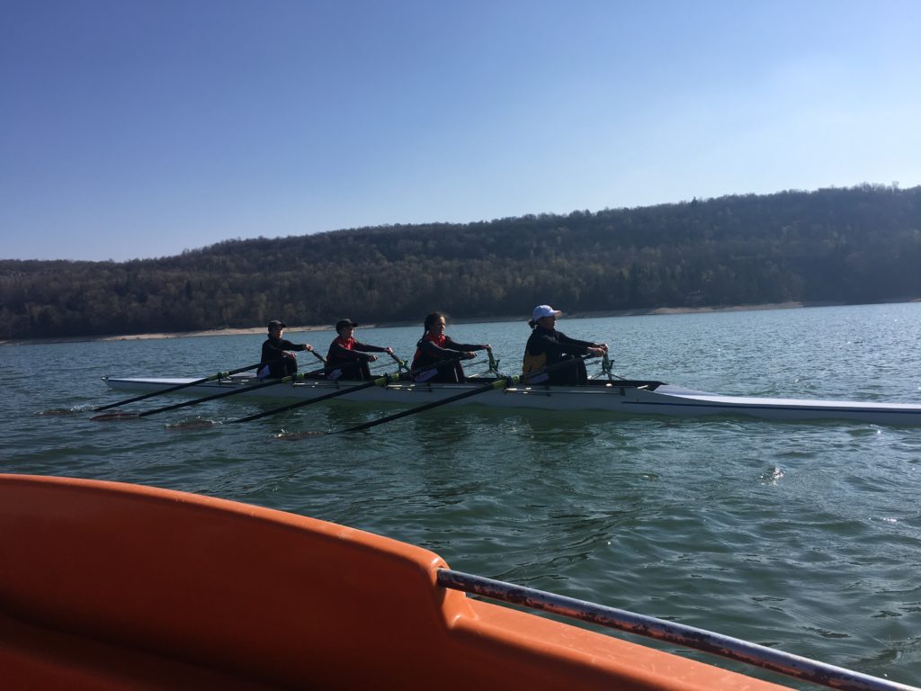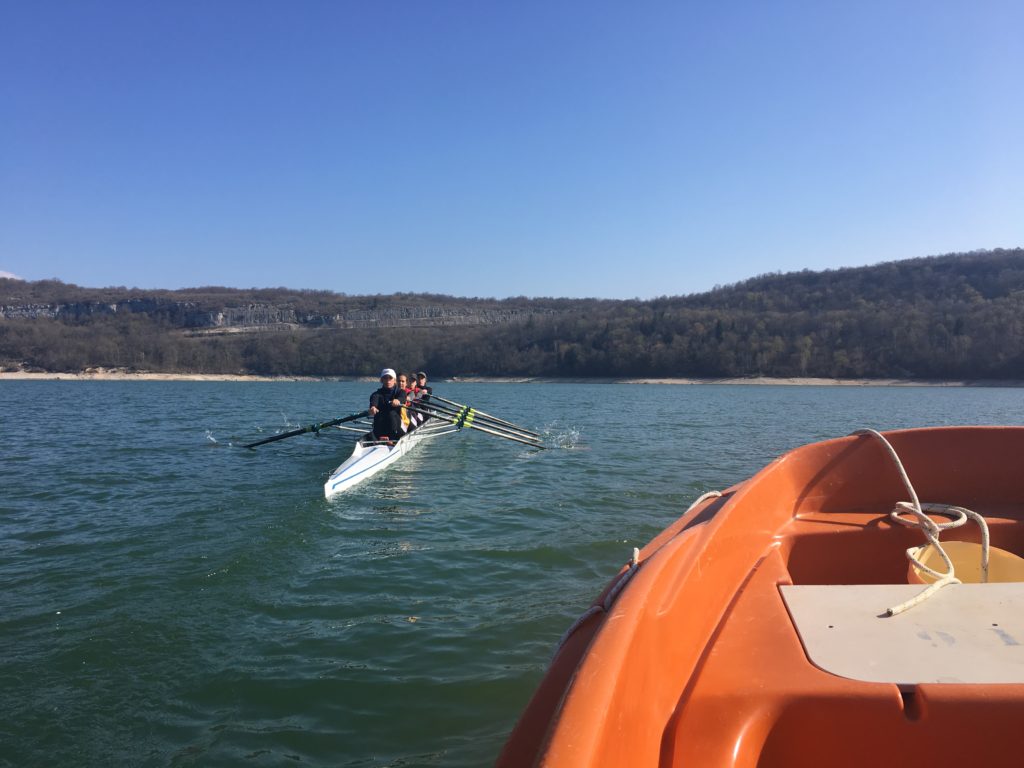 Plus de 30 rameurs et rameuses du club s’entraînent durement sur les eaux de l’ Ain à Orgelet F. à la base nautique de Bellecin.