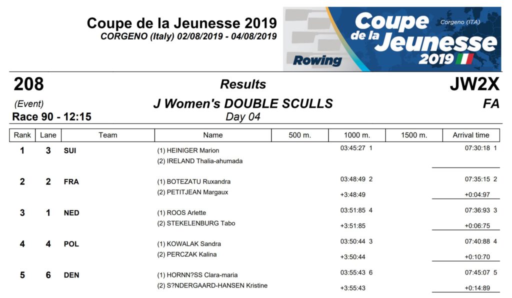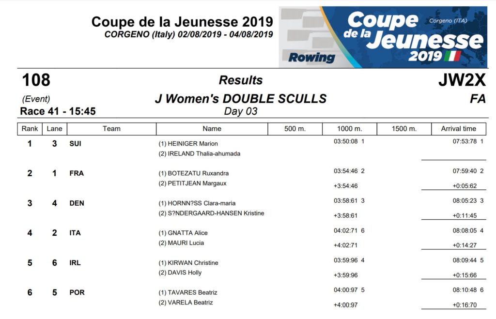 Exploits pour Thalia et Marion le doublé aux Championnats d’Europe juniors espoirs. Elles remportent le double femmes dans la final A du samedi et du dimanche et ceci largement devant la France et le Danemark.