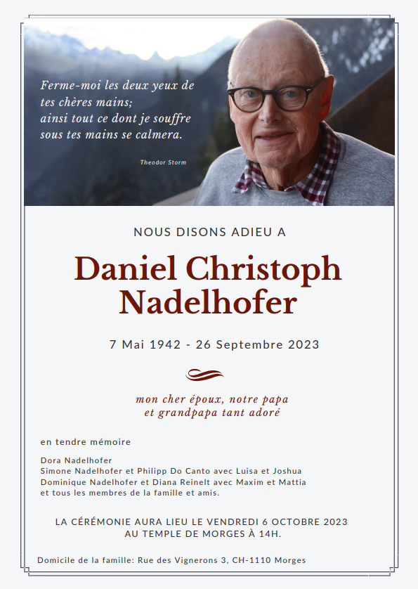 C’est avec une grande tristesse que nous annonçons le décès de Daniel Nadelhofer, un membre passif de notre club. Nous voulons exprimer notre profonde tristesse pour cette perte et offrir notre plus sincère soutien à son épouse, Dora et a sa famille.
