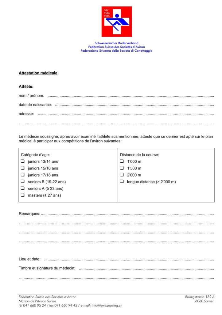 • Pour les rameurs des catégories juniors (U15, U17 et U19), il est également nécessaire de joindre ou de télécharger un certificat médical sportif. Le formulaire correspondant peut être téléchargé directement lors du processus de commande, rempli par le médecin et téléchargé à nouveau lors du processus de commande. Le formulaire peut également être imprimé à partir d’un modèle disponible sur le site web.