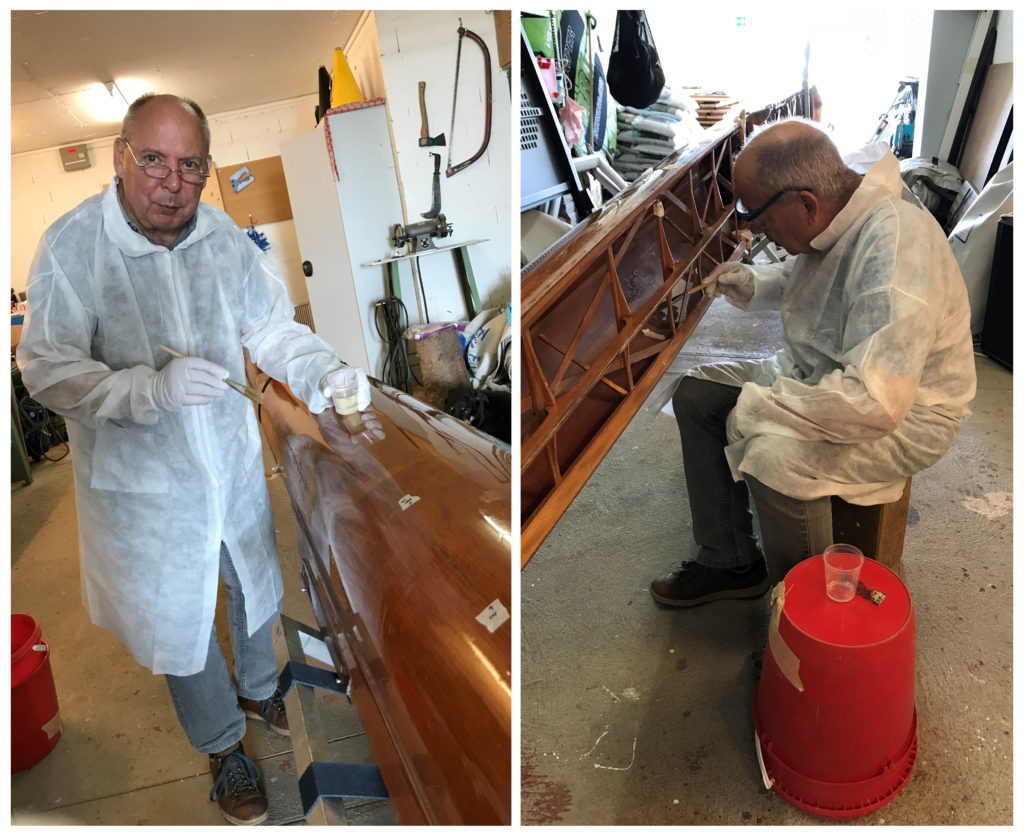 Mais appliquer ensuite la fibre fût un vrai plaisir car les tissus d’aujourd’hui sont de bien meilleure qualité que ce que j’avais utilisé il y a 30 ans. Donc pas besoin de peindre le bateau en blanc, comme je songeais un moment de faire, afin d’ainsi cacher nos travaux! Les nouvelles réparations et joints étants plus fins et robustes, nous avons enlevé au moins autant de poids que ce que nous avons rajouté par la suite. Mais nous n’avons renforcé qu’un sixième de la surface de la coque et la triplette reste donc très fragile, comme tous les vieux bateaux en bois. En dehors de la coque nous avons également réparé les bouts de bois cassés, remplacé les bouchons et refait les joints d’étanchéité. Comme nous ne pouvions pas débuter le gros des travaux avant la fin du mois d’août, nous étions dès le début pressés par le temps, sachant qu’il allait bientôt faire trop froid pour appliquer certains produits. Et en voulant gagner du temps, on en a en réalité perdu énormément.