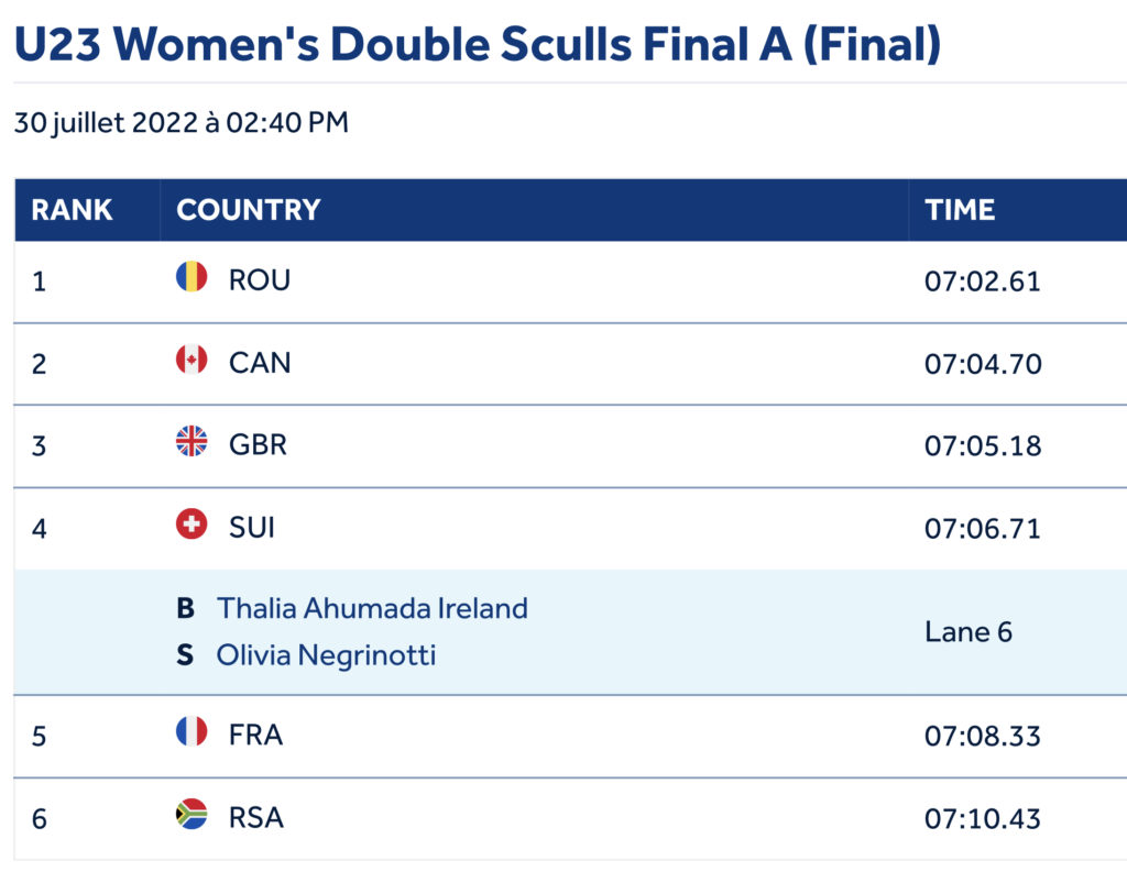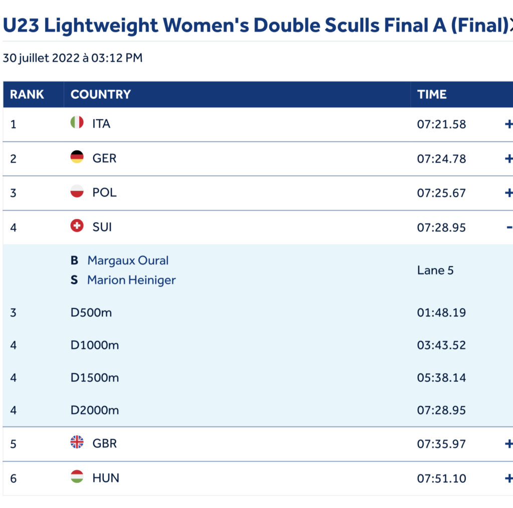 le 30 juillet 2022 se sont achevés les championnats du monde U23. Après avoir bagarré dans leur finale A et avec des conditions peu favorables, nos deux rameuses Margaux Oural en BLW2x avec Marion Heininger et Thalia Ahumada en BW2x avec Olivia Negrinotti terminent chacune à la 4ème place de leurs finales A.