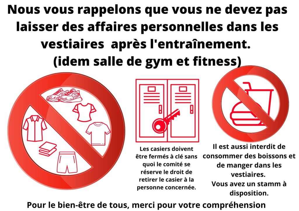 Nous vous rappelons que vos effets personnels ne doivent pas rester dans les vestiaires à l’image des vestiaires des salles de gym.