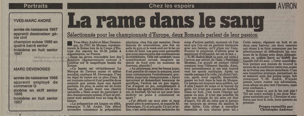 « J’ai débuté car mon père et mon grand-père le pratiquent », se rappellait M. Devenoges. « J’y ai pris goût. Ce qui m’attire, c’est cette constante recherche du coup d’aviron parfait, moment où l’on sent que l’on est en parfaite harmonie avec son bateau, qu’il glisse sur l’eau. Fournir le minimum d’efforts pour le maximum d’efficacité, tel est le but. »