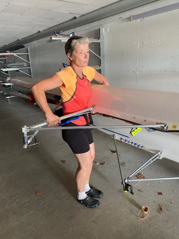 Lorella sort avec autant de délicatesse le deuxième skiff. Place aux réglages des bateaux sur les chevalets avec les conseils avisés de Kiki.