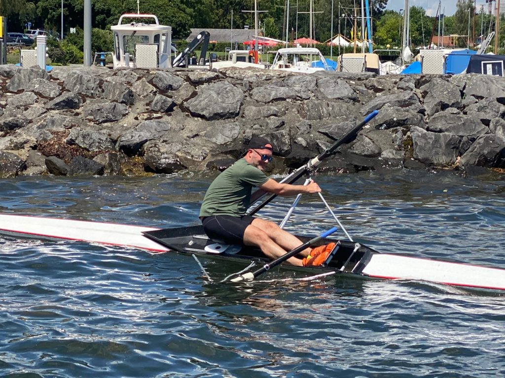 Philippe et Andrea amènent les skiffs sur l’eau, et là, à tour de rôle, on essaie d’embarquer, après avoir essayé, de toutes les manières possibles, de fermer les tollets: à plat ventre, accroupi, à moitié sur le bateau, le ridicule ne tue pas… Mathieu et Marc-André conseillent, rassurent, expliquent, réexpliquent. Quelle patience. Merci.
